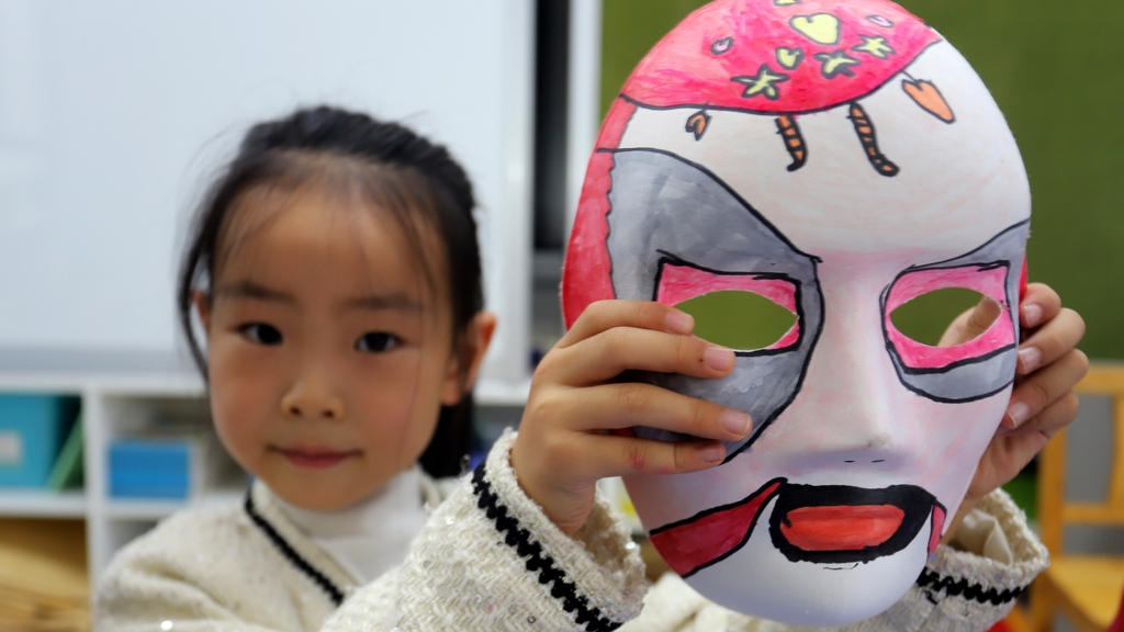 Crianças de jardim de infância pintam máscaras da Ópera de Beijing
