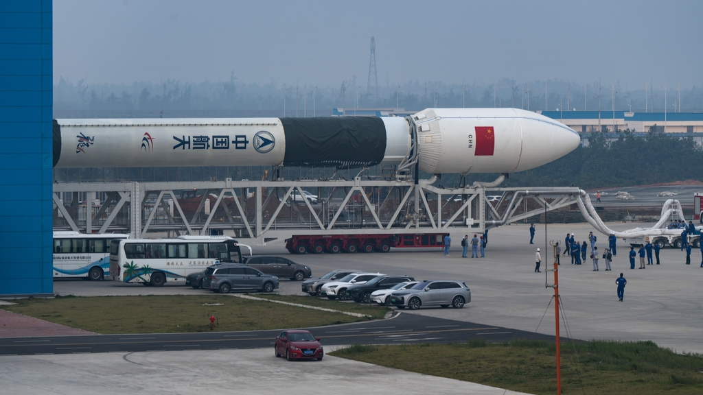Foguete transportador é instalado em campo de lançamento em Hainan