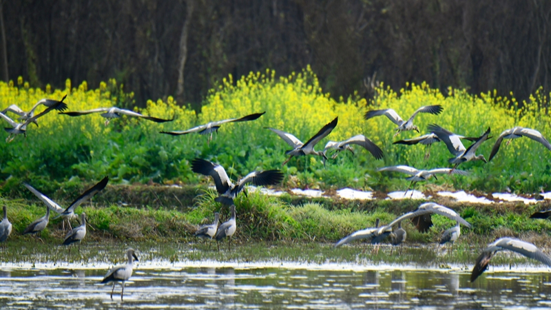 Cegonhas passeiam em campo de flores de canola em Yunnan